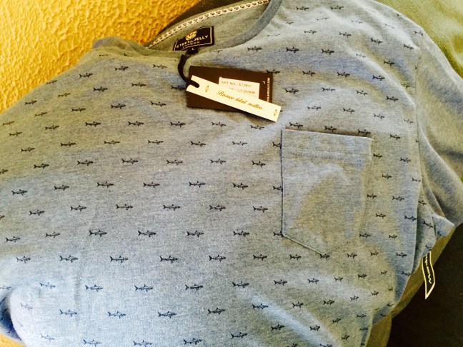 Last week, I bought a T-shirt. It enticed me brain with little sharks and vast blueness, not to mention the little pocket with…. Just blue. Anyways, I figured a large would size me up right. I’m not super fat, but because of my mostly German and Russian heritage, I’m husky. I then, after purchase, realized it was a British company and didn’t think much of it until I tried this work-of-art onto my work-of-art body. And it was uncomfortably small and tight.