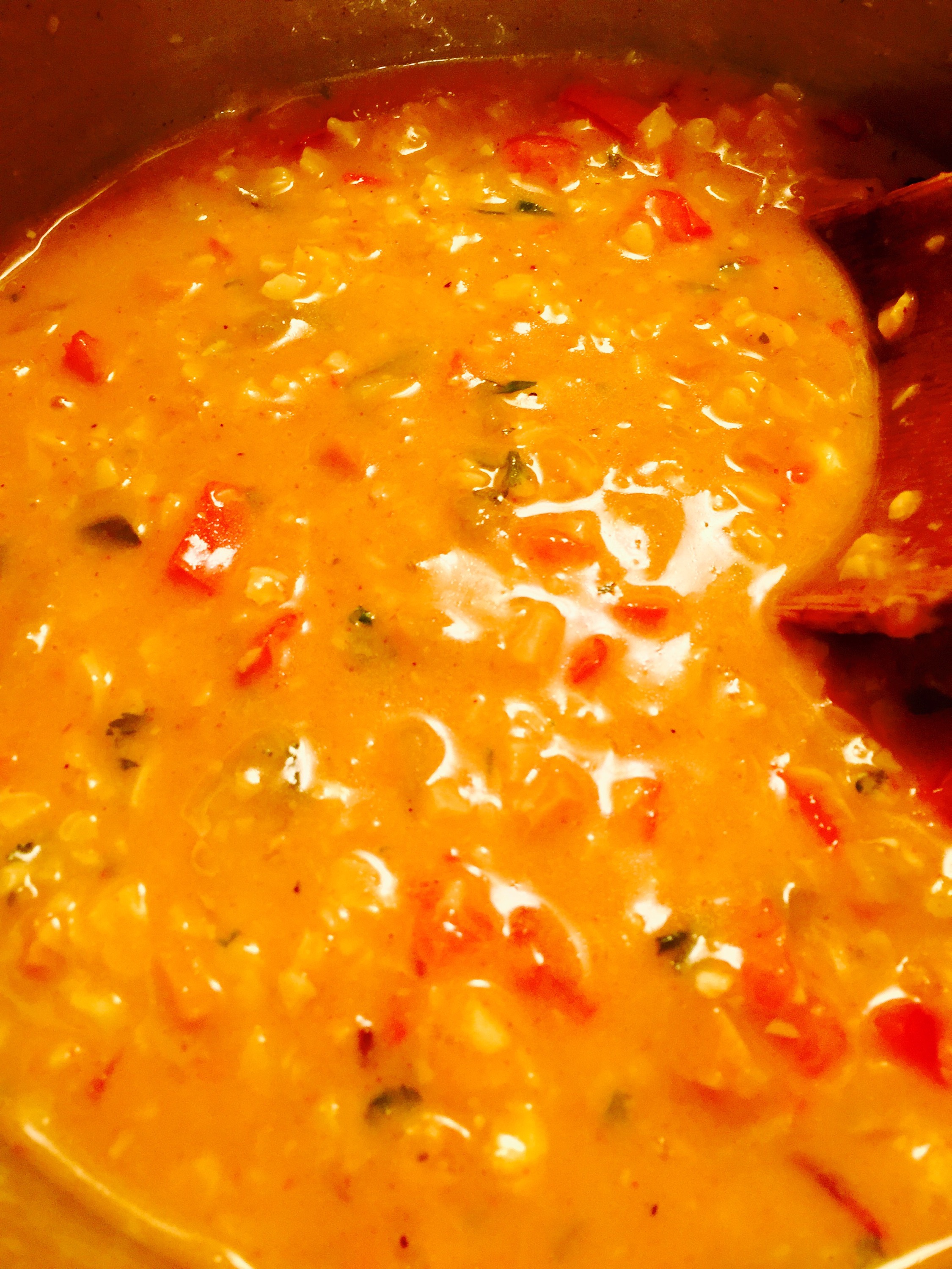 -Simmer almond milk. Again, I do not measure with anything other than instincts and eyes. Add seasonings and chopped and diced ingredients. Add Corn Starch last! I chose to keep it a little chunky, blend if desired.