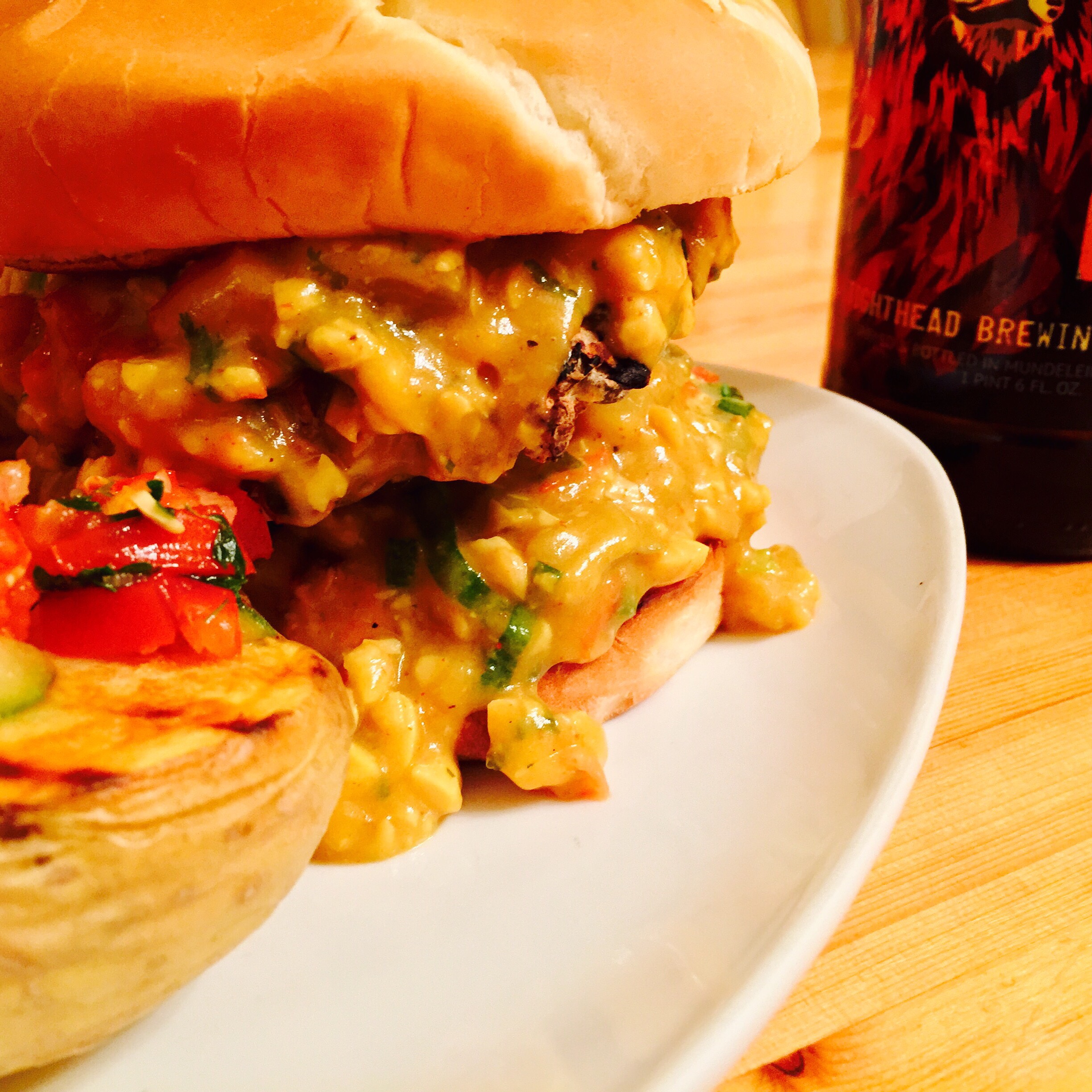Monday I had flowing creative energies overflowing my body and persona. I love Mondays. I had a leftover Vegan Mexican concoction in the fridge. I also wanted to make Vegan burgers. I do not remember exactly what was in the Vegan Mexican concoction, so I won’t even get into it. I literally just added water and Corn Starch to form patties and threw them in the oven for a bit.