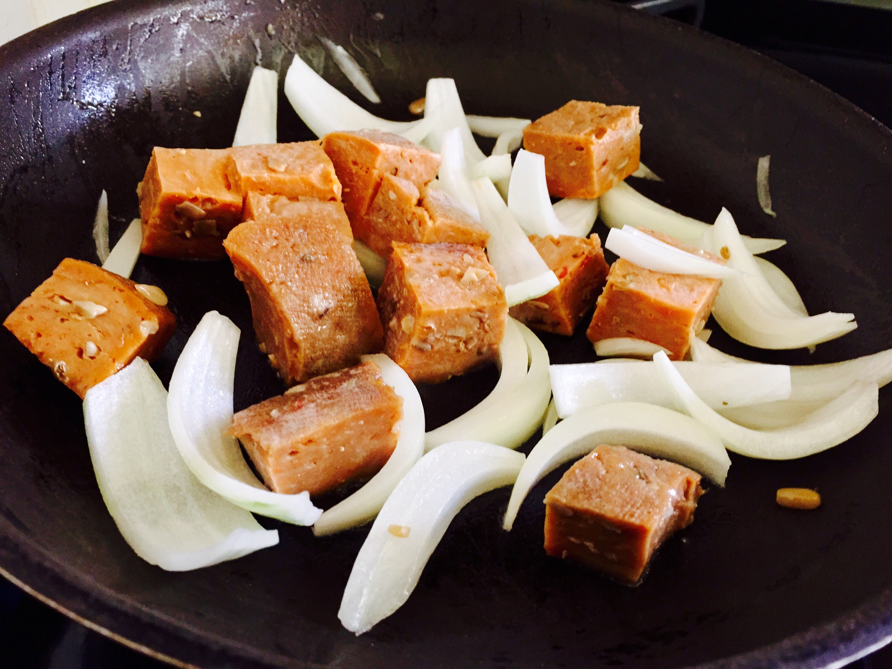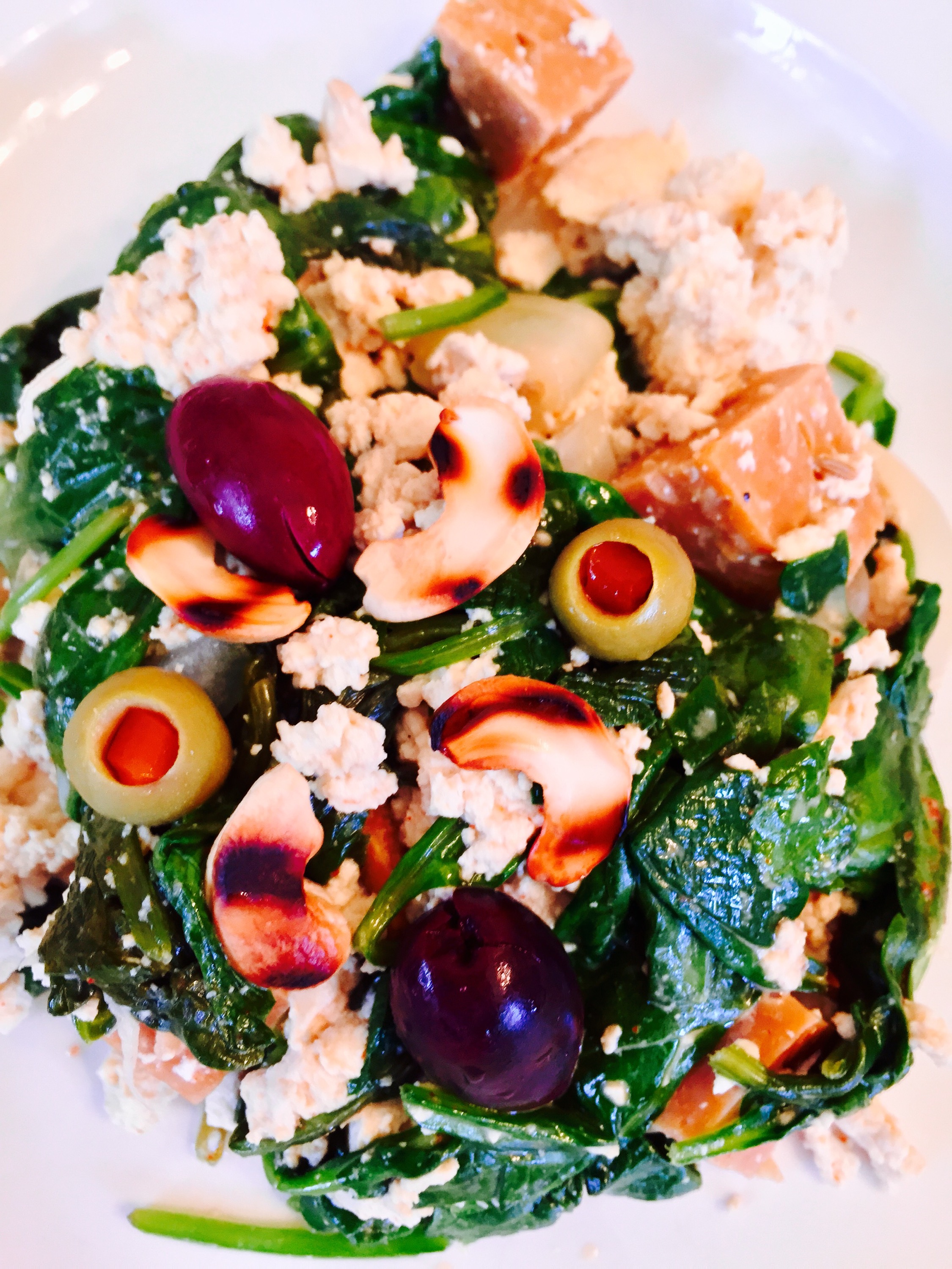 -Saute Onions and Seitan for a few minutes. I used just a tad cooking spray and added Manzanilla brine and Balsamic Vinegar. I let simmer for a few minutes before adding Vegenaise, Chipotle and Kalamata brine. After mixing and stirring, I then added a generous amount of Spinach and tossed and turned for a couple of minutes. I did strain the salad before plating it and then topped with Olives and Toasted Cashews. mmmmmmm