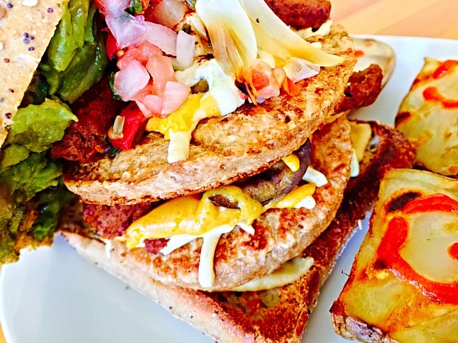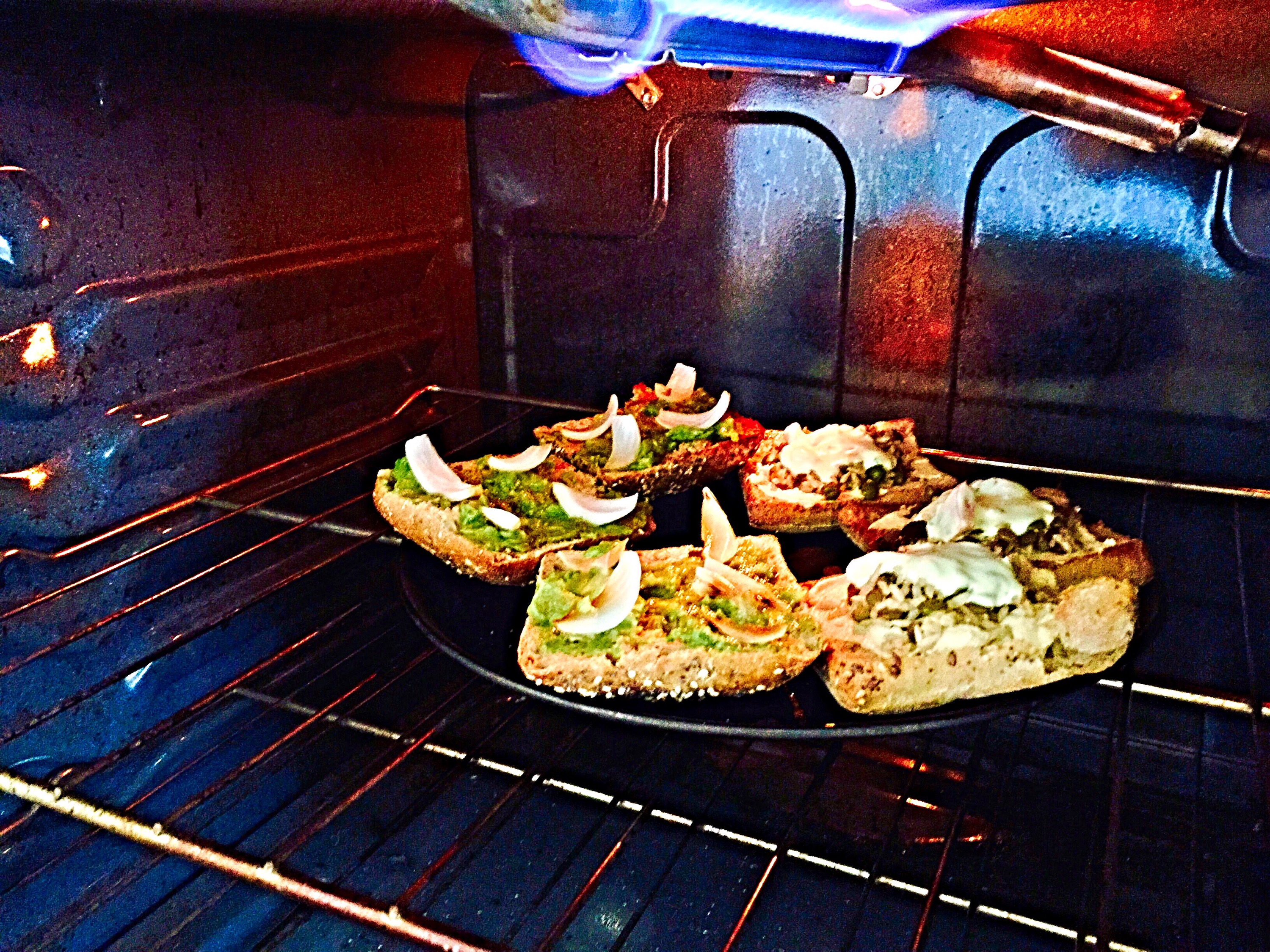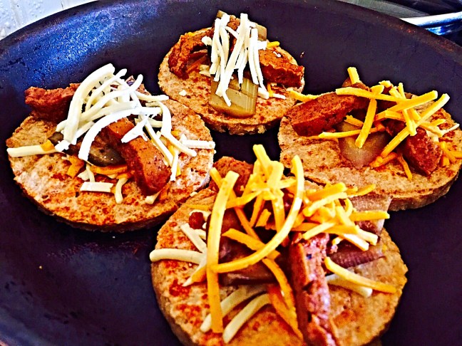 - Instead of flipping, I broiled the top. The patties were’t as solid as I would’ve liked. I broiled Daiya on inside of Buns on top of Spinach and on top of patties with Mushroom and Eggplant on top.
