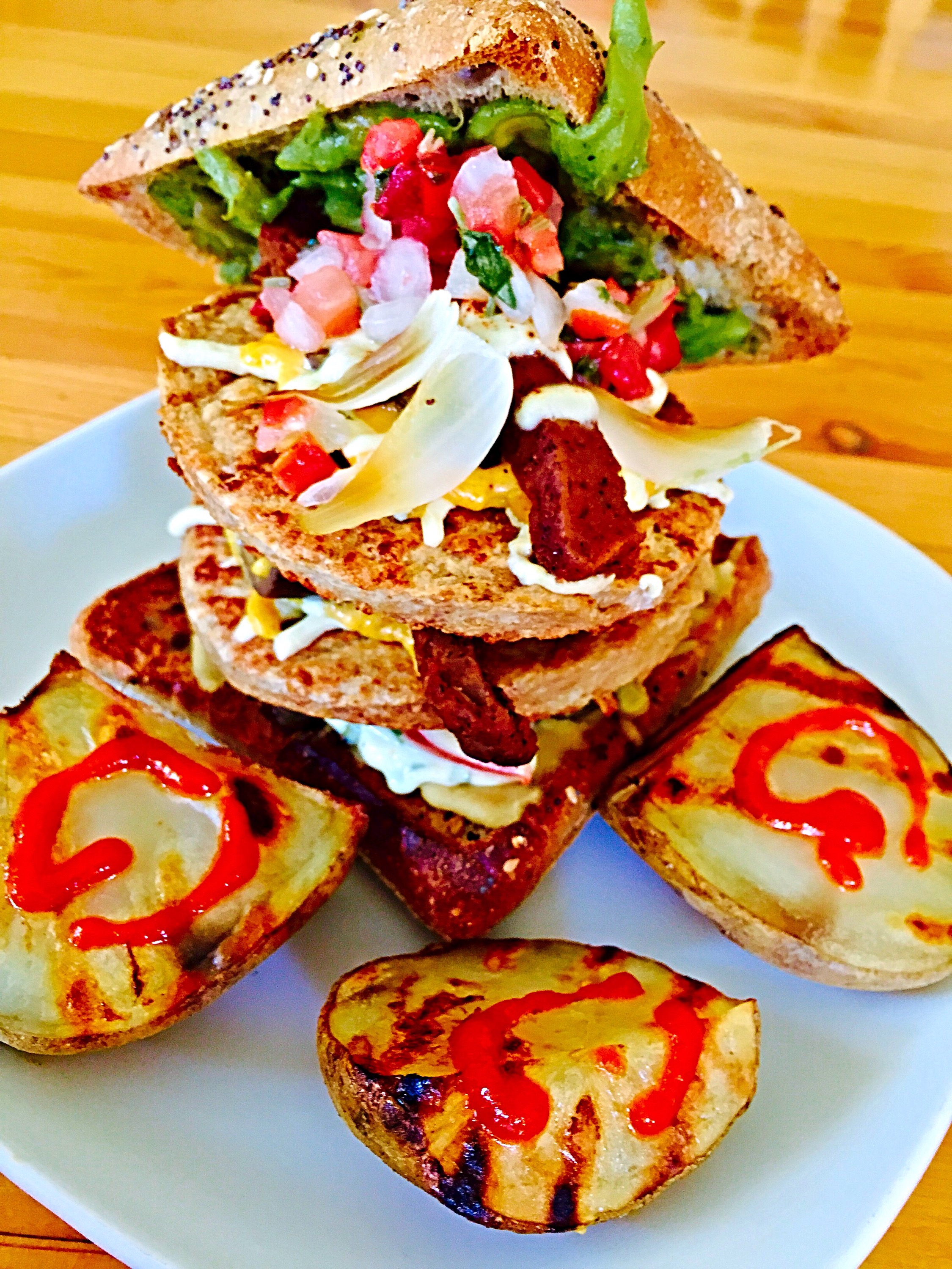 - I grilled another Potato for the side. I constructed the Dubbel Boca onto the bottom (already grilled (on the inside)) Bun creating a tight seal of Chipotle Mustardation between the Boca’s. I then piled Tom Relly (it’s short for Tomato Relish, ok…)
