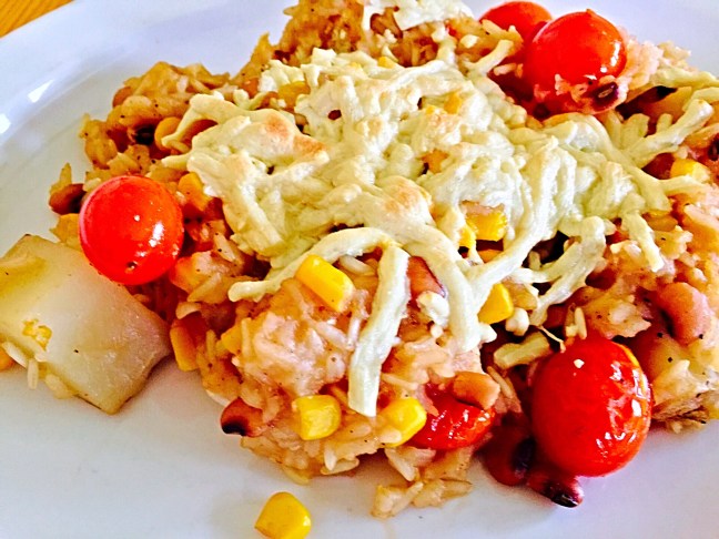 - I plated the Superfood Rice and put sautéed gravy sauce (?) over top and broiled with some Daiya.