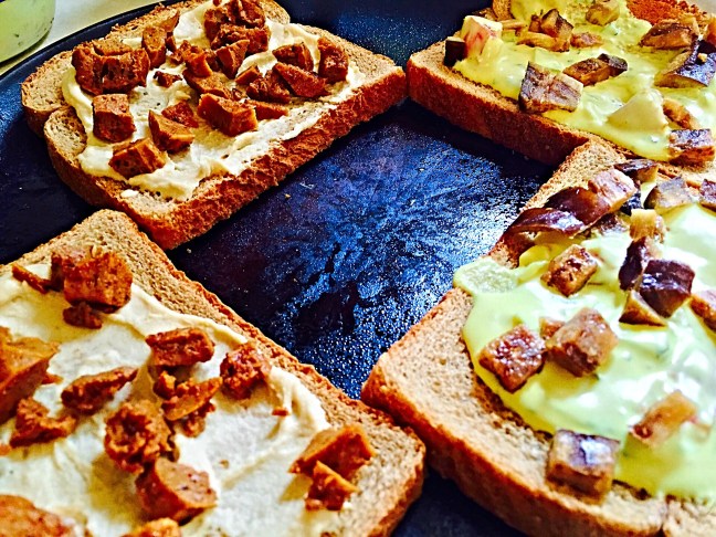 - Toast one side of Wheat Bread and smother bottom with Hummus and top with Vegenaise Upgraded w/ eggplant on top of Hummus and Seitan on top of Vegenaise Upgraded & broil
