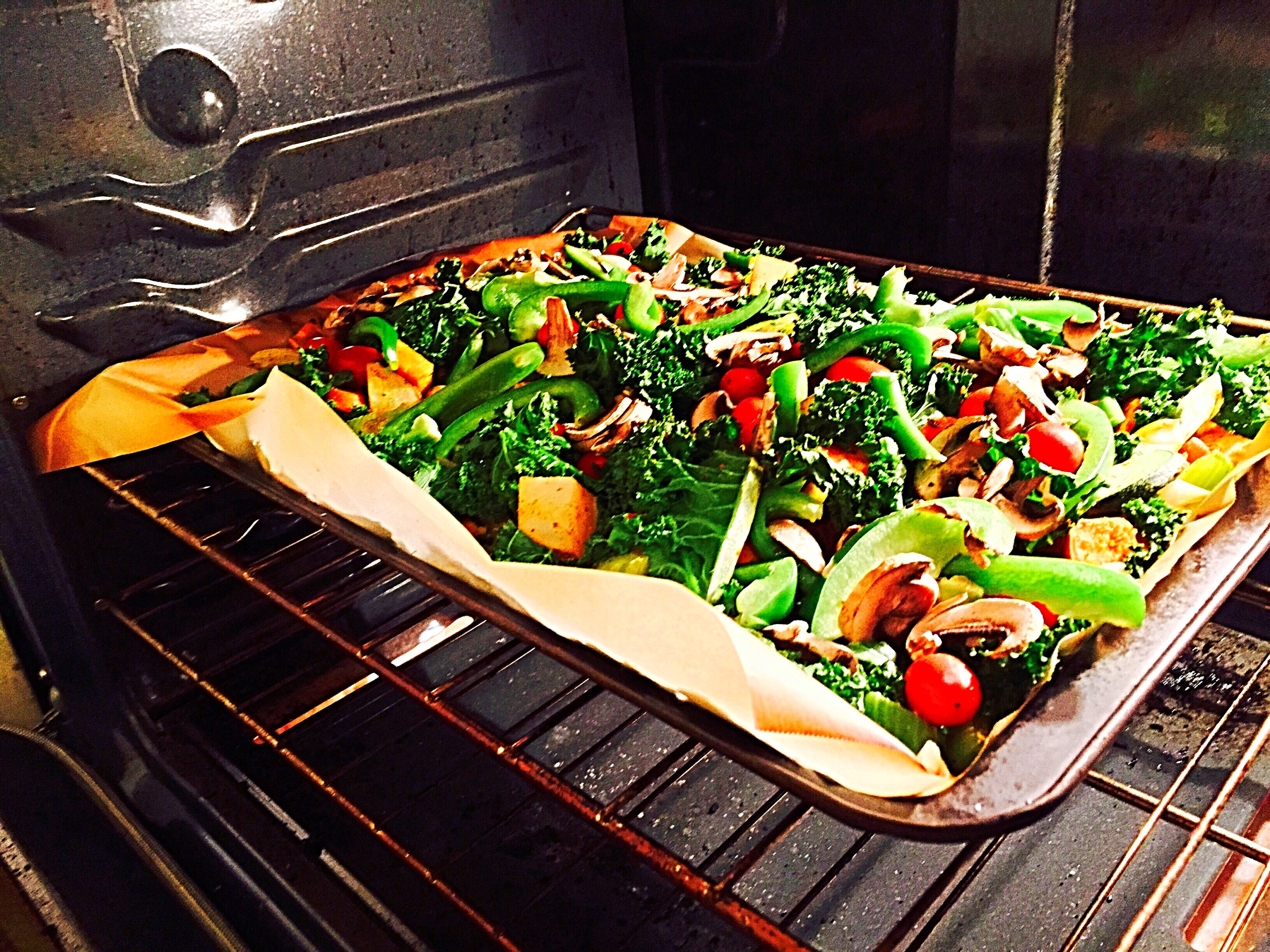 - I dry roasted and did not add any oil. I used one pan with PARCHMENT PAPER:) Added things at different times because not all veggies roast in the same time. I then mixed everything together and topped with Yam Lentili. I did not roast the Grape Tomatoes. I heated them up in the Cashew ‘milk’.