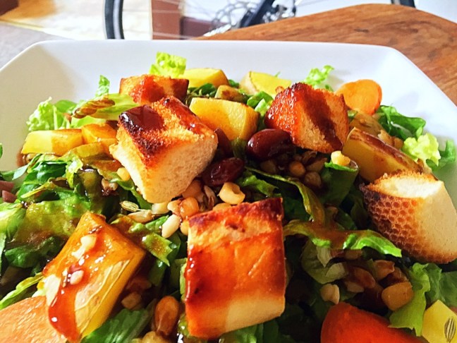 I chopped Romaine Lettuce finely. I combined Romaine, Scallions, Carrots, Black Beans, Raw Spanish Peanuts into a bowl after roasting Golden Potatoes, Fennel, Corn and Garlic lightly roasted. I also roasted some bread. And my dressing of choice was pre-made Balsamic Vinaigrette mixed with Sriracha hot sauce. It was delicious and my heart, tastebuds and tummy had a threesome.