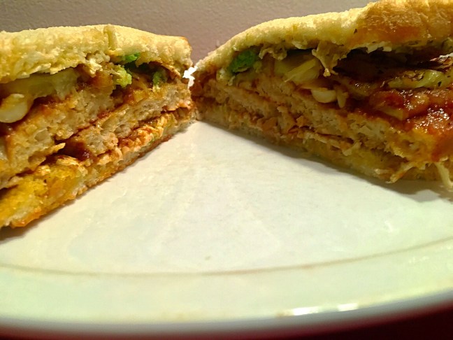 Morning Star makes a Vegan version that is damn good. I am the meatless butcher and I decided to take a stab at it and destroy some plants. Garlic Daiya Bread was slowly baked while the ⓋcRibwich ‘meat’ was pan-fried above on the stovetop.