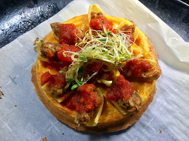 Place Super Ⓥausage stuffed Rotini’s on Waffle and slightly broil. Add Back Burner Marinara and a garnish. Alfalfa Sprouts were used with this one.