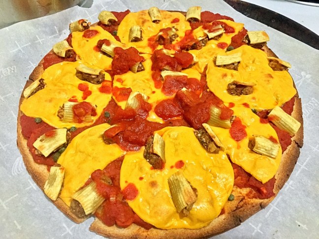 Clobber your (Ⓥ) Pizza Dough or Crust with thickened Back Burner Marinara. Weight that Pizza Sauce down with generous amounts of Capers. Excellent Sauce tends to want to float up to where its level of greatness actually is:)