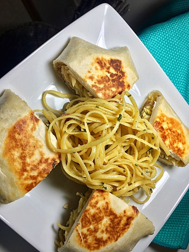 I saw a video online this morning on how to make a Taco Bell Crunchwrap. Craving Pasta constantly, I adapted an idea to make something absolutely edible. Pasta plated to be consumed with hands and a fork.