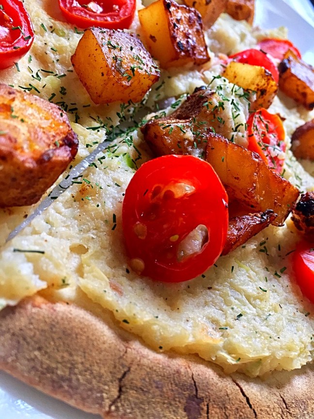 Pitas were smothered with Mashed Cauliflower to be topped with sliced Tomatoes and the roasted Greek Potatoes before being broiled for a few minutes.