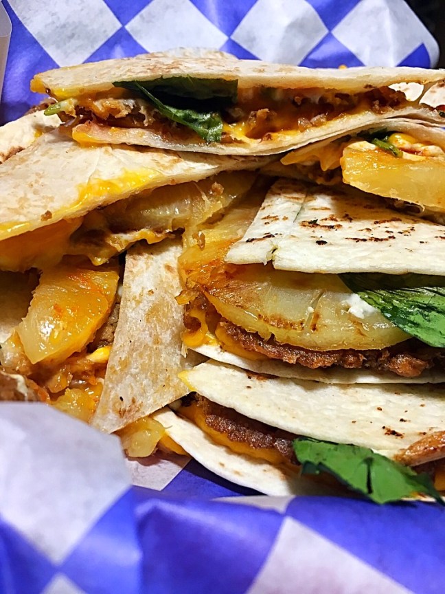 Pineapples were pan-fried and utilized. Daiya galore. A little Spinach and many of smiles.