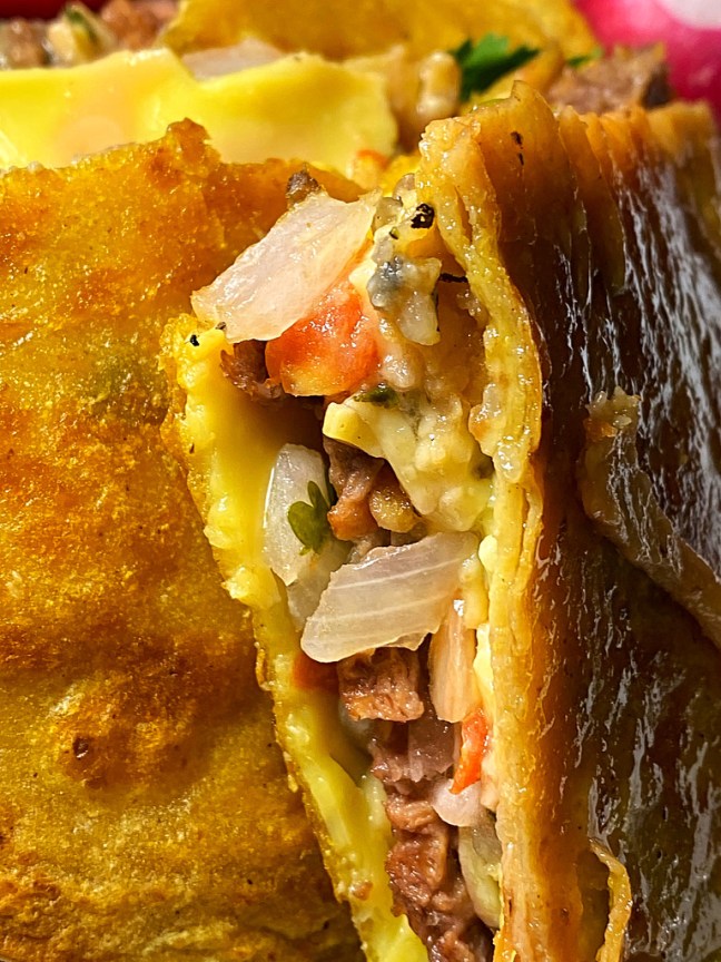 In a skillet, light oil was heated before throwing in a surplus of Broccoli Florets to be scorched. In the fridge and then out of the fridge, leftover (baked) Onion Rings were utilized by taking a chopped form to be tossed in with the Broccoli. Seasoned with Crushed Rep Pepper Flakes, Garlic Powder, Sea Salt & Pepper, the skillet was popped into the oven to lightly roast prior to adding Ⓥegan Gouda. Broiled, roasted and melted ever so nice, Corn Tortillas were stuffed with this greatness and charred once again.