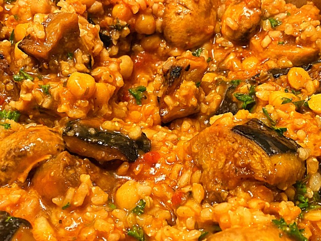 Pre-cooked Brown Rice was added with chopped Parsley and the Roasted Eggplant.