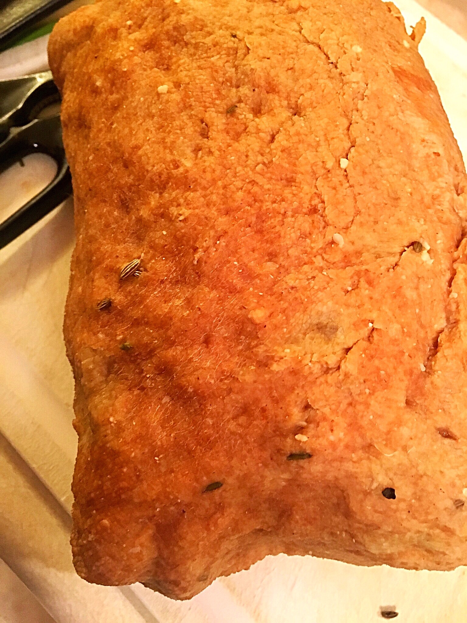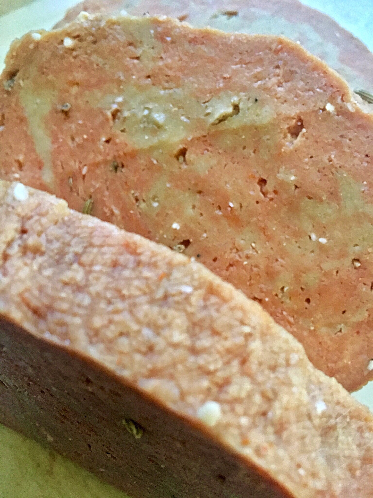 This Seitan batch included Vital Wheat Gluten, Fennel Seed, Sesame Seed, Sea Salt, White Pepper, Garlic, Tomato Sauce, Water and Cayenne. After mixing and kneading, the loaf was wrapped in a dairy-free Cheese Cloth. In a pot, Veggie Broth, Bay Leaves, cracked Pepper, Sea Salt and Garlic Powder we’re combined. The Seitan loaf roasted in this mixture, turning and flipping halfway through.