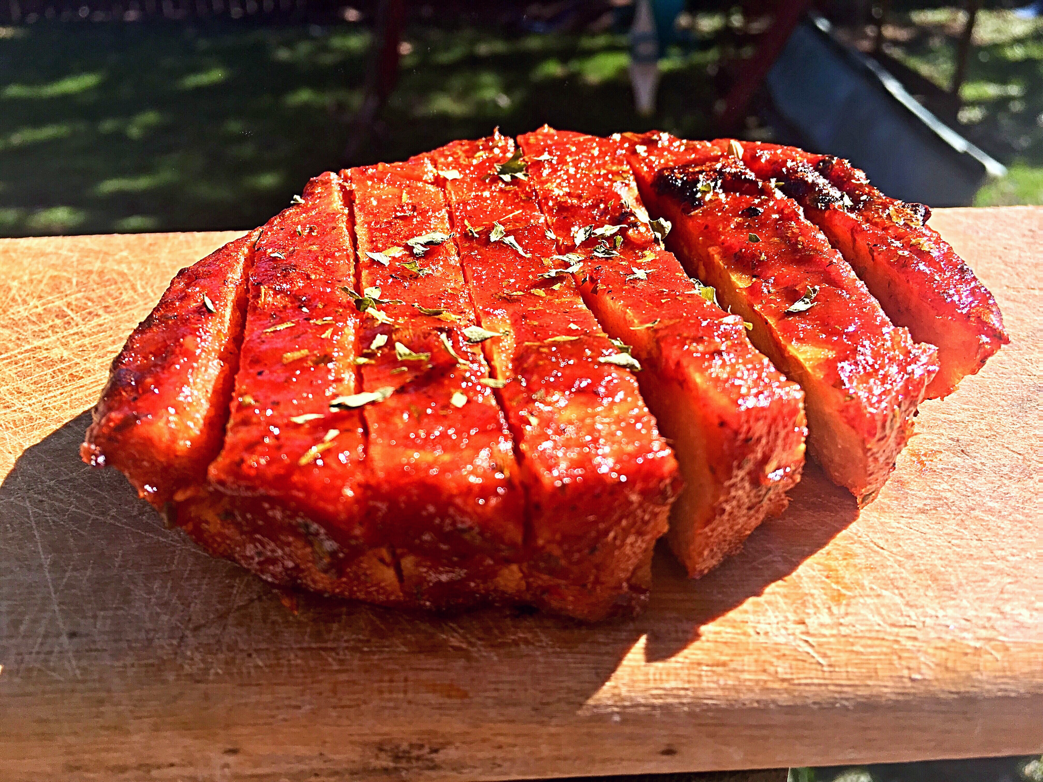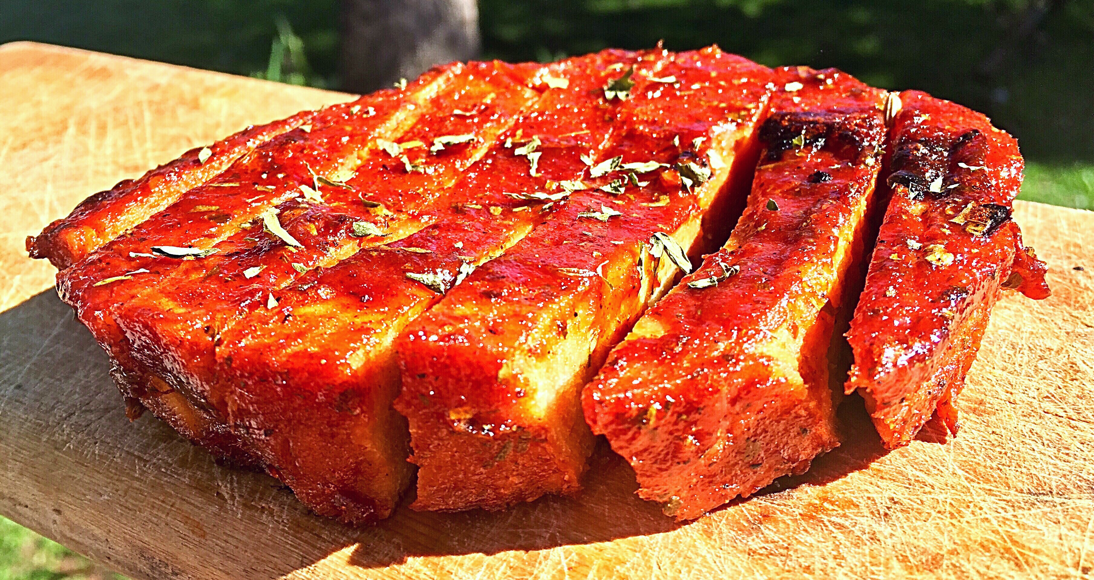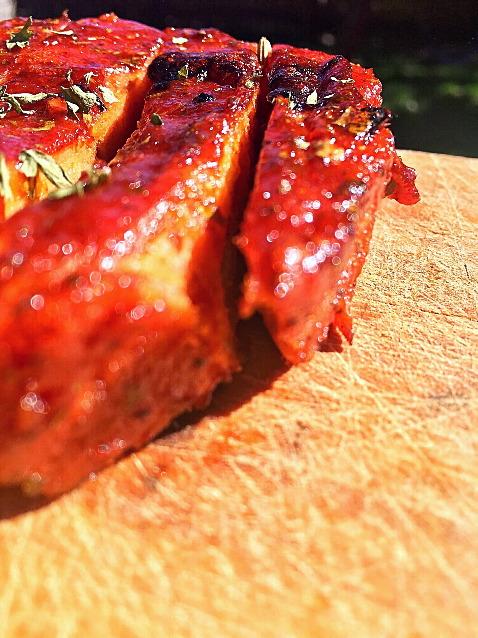 The Seitan was sliced thickly and panfried on both sides for color//texture. Tomato Sauce, Liquid Smoke, BBQ Sauce, Chipotle Powder, Tarragon, Pepper and Brown Sugar were generously mixed and lathered all over the Seitan before being baked. Sliced, relathered and additionally baked, the Seitan concluded.
