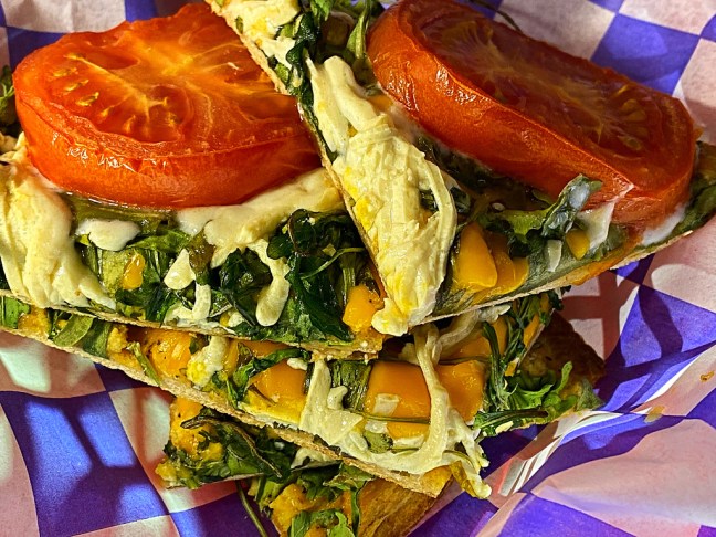 Remaining Daiya slices were added along with Onion & Tomato slices. To finish this hefty loaf, the Just Egg/’cheese’/Caper mixture was added and finished with Spinach.